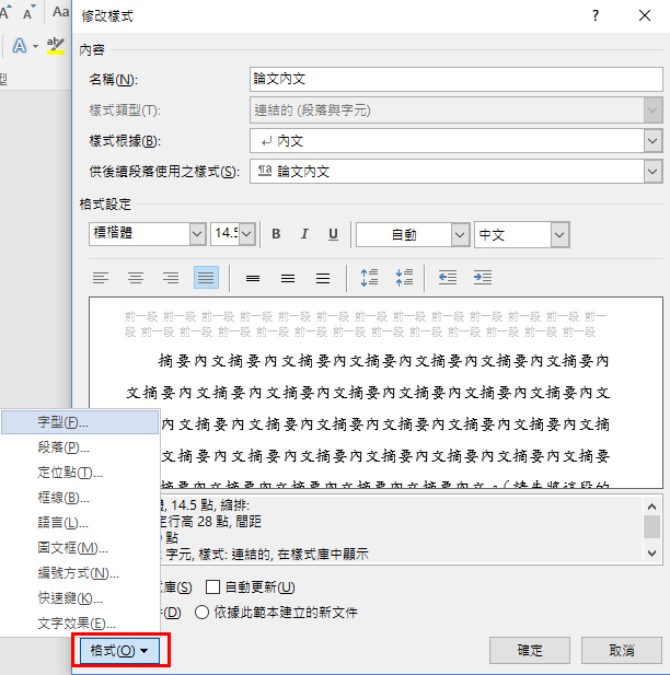 開啟範例檔, 選取摘要的內容段落,設定文字採用標楷體14.5點字,左右對齊,第一行縮排2字元,固定行高28點。 儲存為新的快速樣式,命名為「論文內文」。將論文所有內容(非標題的部分)都套用此樣式。 (可按 F4鈕 重複上一動作)
